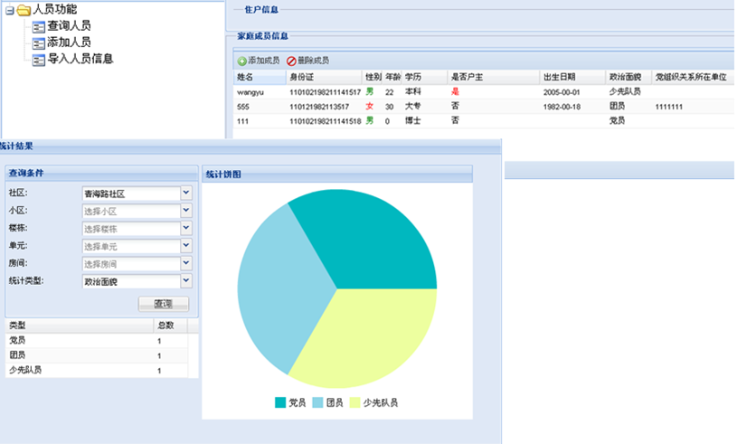 人口管理是社區(qū)工作的主要部分,包括常住人口、暫住人口、流動人口、重點(diǎn)人口等。如何科學(xué)有效的對這些人口進(jìn)行統(tǒng)計、分析、查詢等,是社區(qū)工作的重點(diǎn)。產(chǎn)品提供的人口管理模塊,可以實(shí)現(xiàn)對各類人口的分類查詢、統(tǒng)計分析等功能,實(shí)現(xiàn)對人口的可視化、科學(xué)化管理。