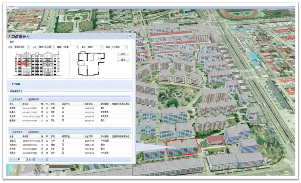 通過將人口信息與三維場景中房屋模型信息進行關聯(lián)管理,一方面可以“以人定房”,實現(xiàn)人員定位,查找到社區(qū)特殊人員住所;一方面可以“以房找人”,通過查詢?nèi)S系統(tǒng)中的建筑物,可以統(tǒng)計相關人員的分布。人房有三種常見關系:住戶關系、租戶關系和商戶關系。通過建立人員和房屋的關系,實現(xiàn)將人員精確到房間的管理粒度。在三維場景中通過框選、點選、圈選社區(qū)內(nèi)的建筑物,可以將建筑物內(nèi)每個單元、樓層、甚至具體到房間內(nèi)的各類人員進行統(tǒng)計、查詢、定位。例如:查詢建筑物內(nèi)的殘疾人,所有居住殘疾人的房間會高亮度顯示。實現(xiàn)人口數(shù)據(jù)與GIS空間信息的結合。對轄區(qū)內(nèi)出租房屋以房屋所有人為核心進行登記管理,全面掌握出租房屋的所有人、居住人員信息以及房屋情況,對轄區(qū)內(nèi)出租房屋進行嚴格管理。在三維系統(tǒng)中,可以將轄區(qū)內(nèi)的出租房屋高亮度顯示,并對房屋內(nèi)居住人員信息進行查詢。
